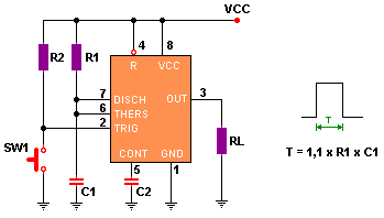 La salida del circuito es inicialmente cero, el transistor está saturado y no permite la carga del condensador C1. Pero al pulsar SW1 se aplica una tensión baja en el terminal de disparo TRIGGER, que hace que el biestable RS cambie y en la salida aparezca un nivel alto. El transistor deja de conducir y permite que el condensador C1 se cargue a través de la resistencia R1. Cuando la tensión en el condensador supera los 2/3 de la tensión de alimentación, el biestable cambia de estado y la salida vuelve a nivel cero.