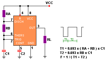 Cuando se conecta la alimentación, el condensador está descargando y la salida del 555 pasa a nivel alto hasta que el condensador, que se va cargando, alcanza los 2/3 de la tensión de alimentación, con esto la salida del biestable RS pasa a nivel «1», y la salida del 555 a ceroy y el condensador C1 comienza a descargarse a través de la resistencia RB. Cuando la tensión en el condensador C1 llega a 1/3 de la alimentación, comienza de nuevo a cargarse, y asi sucesivamente mientras se mantenga la alimentación.