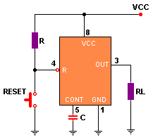 La gama de aplicaciones del circuito se incrementa, pues se dispone de un terminal de reset, activo a nivel bajo, que se puede utilizar para poner a nivel bajo la salida del 555 en cualquier momento.
