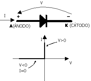En la Figura 1 se muestran el símbolo y la curva característica tensión-intensidad del funcionamiento del diodo ideal. El sentido permitido para la corriente es de A a K.