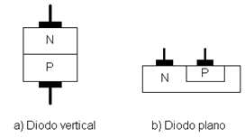 Actualmente los diodos se fabrican a partir de la unión de dos materiales semiconductores de características opuestas, es decir, uno de tipo N y otro de tipo P. A esta estructura se le añaden dos terminales metálicos para la conexión con el resto del circuito. En la Figura 3: se presenta el esquema de los dos tipos de diodos que se fabrican actualmente, el diodo vertical y el plano.