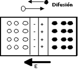 En el ejemplo del capítulo 5, los gases difunden completamente hasta llenar las dos estancias de la caja y formar una mezcla uniforme. Sin embargo, a diferencia de lo que ocurre con los gases de aquel ejemplo, en este caso están difundiendo partículas cargadas. La distribución de cargas formada en la región de la unión provoca un campo eléctrico desde la zona N a la zona P. Este campo eléctrico se opone al movimiento de portadores según la difusión, y va creciendo conforme pasan más cargas a la zona opuesta. Al final la fuerza de la difusión y la del campo eléctrico se equilibran y cesa el trasiego de portadores. En ese momento está ya formado el diodo de unión PN, y como resultado del proceso se ha obtenido: