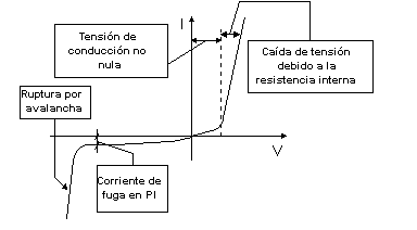 En la Figura vemos representadas más claramente estas diferencias entre los comportamientos del diodo de unión PN e ideal.