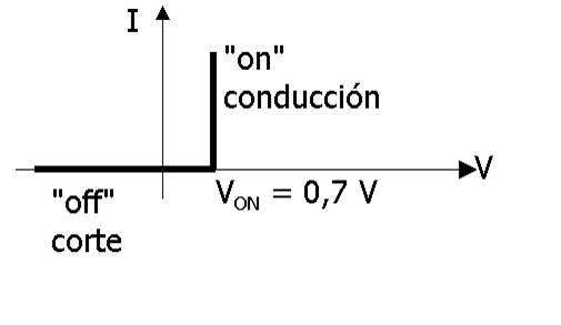 - Conducción o Polarización Directa «On», donde la tensión es VON para cualquier valor de la corriente.