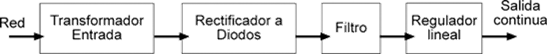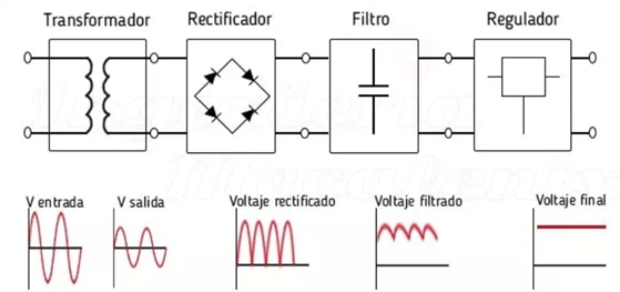 La función de una fuente de alimentación es convertir la tensión alterna en una tensión continua y lo más estable posible, para ello se usan los siguientes componentes: 1.- Transformador de entrada; 2.- Rectificador a diodos; 3.- Filtro para el rizado; 4.- Regulador (o estabilizador) lineal. Este último no es imprescindible.