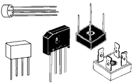 Es tan común usar este tipo de rectificadores que se venden ya preparados los cuatro diodos en un solo componente. Suele ser recomendable usar estos puentes rectificadores, ocupan menos que poner los cuatro diodos y para corrientes grandes vienen ya preparados para ser montados en un radiador. Este es el aspecto de la mayoría de ellos: