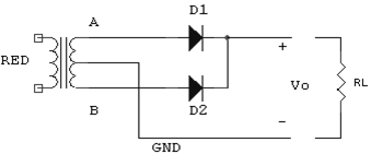 La forma de la onda de salida es idéntica a la del rectificador en puente, sin embargo este rectificador precisa de un transformador con toma media en el secundario. Un transformador de este tipo tiene una conexión suplementaria en la mitad del arrollamiento secundario: