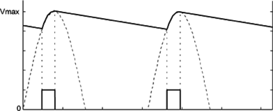 La tensión en la carga es ahora casi una tensión ideal. Solo nos queda un pequeño rizado originado por la carga y descarga del condensador. Para reducir este rizado podemos optar por construir un rectificador en puente: el condensador se cargaría el doble de veces en el mismo intervalo teniendo así menos tiempo para descargarse, en consecuencia el rizado es menor y la tensión de salida es mas cercana a Vmax.