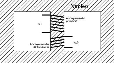 La corriente que circula por el arrollamiento primario (el cual está conectado a la red) genera una circulación de corriente magnética por el núcleo del transformador. Esta corriente magnética será más fuerte cuantas más espiras (vueltas) tenga el arroyamiento primario. Si acercas un imán a un transformador en funcionamiento notarás que el imán vibra, esto es debido a que la corriente magnética del núcleo es alterna, igual que la corriente por los arrollamientos del transformador