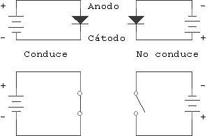 El rectificador es el que se encarga de convertir la tensión alterna que sale del transformador en tensión continua. Para ello se utilizan diodos. Un diodo conduce cuando la tensión de su ánodo es mayor que la de su cátodo. Es como un interruptor que se abre y se cierra según la tensión de sus terminales: