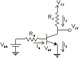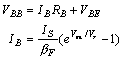 La malla formada por la pila VBB, la resistencia de base (RB) y la unión BE determinan la corriente de base (y, por tanto, la de colector y la de emisor). En efecto, como la corriente de base y la tensión de base-emisor son la solución del siguiente par de ecuaciones (en activa):